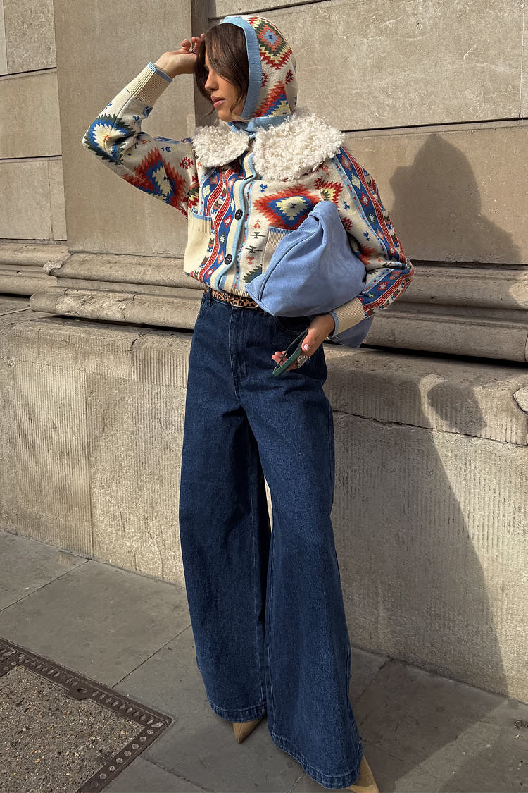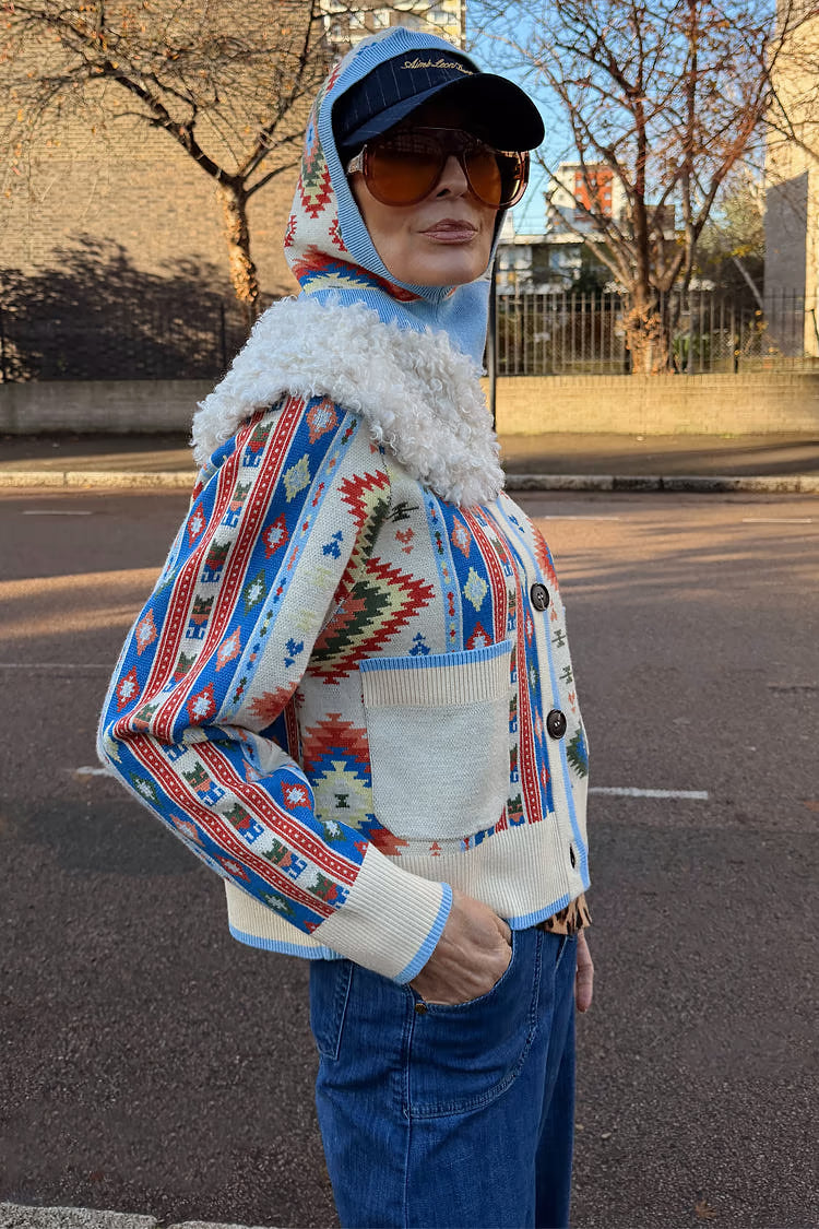 Our bestselling knits are weighty, soft touch and a definite wardrobe staple! In our new Bridget print featuring classic geometric motifs in contrast blue and orange tones that bring a pop of colour to the cream base. With a detachable wool collar that allows you to style in a multitude of ways.