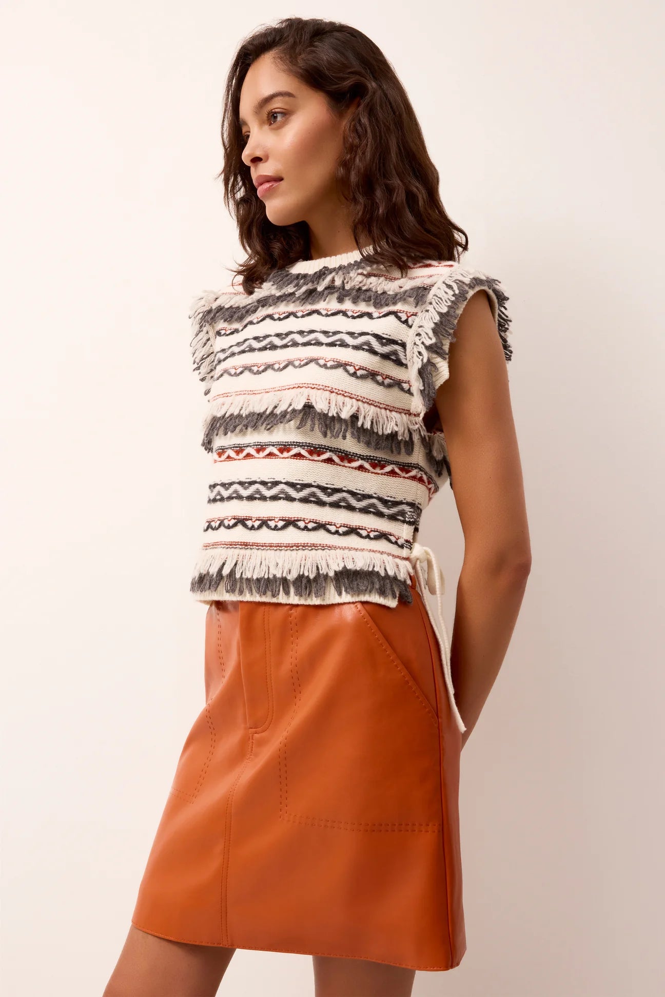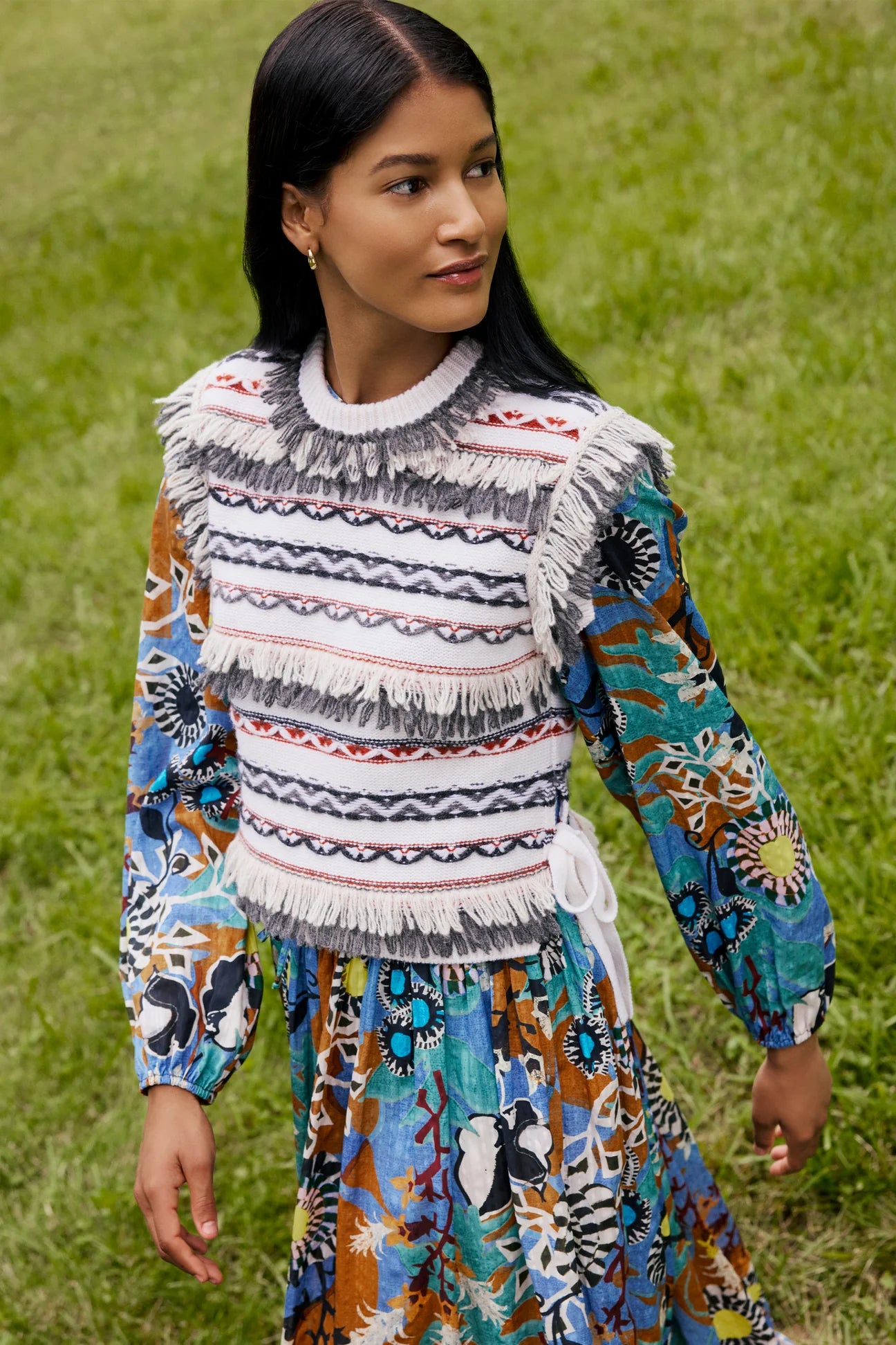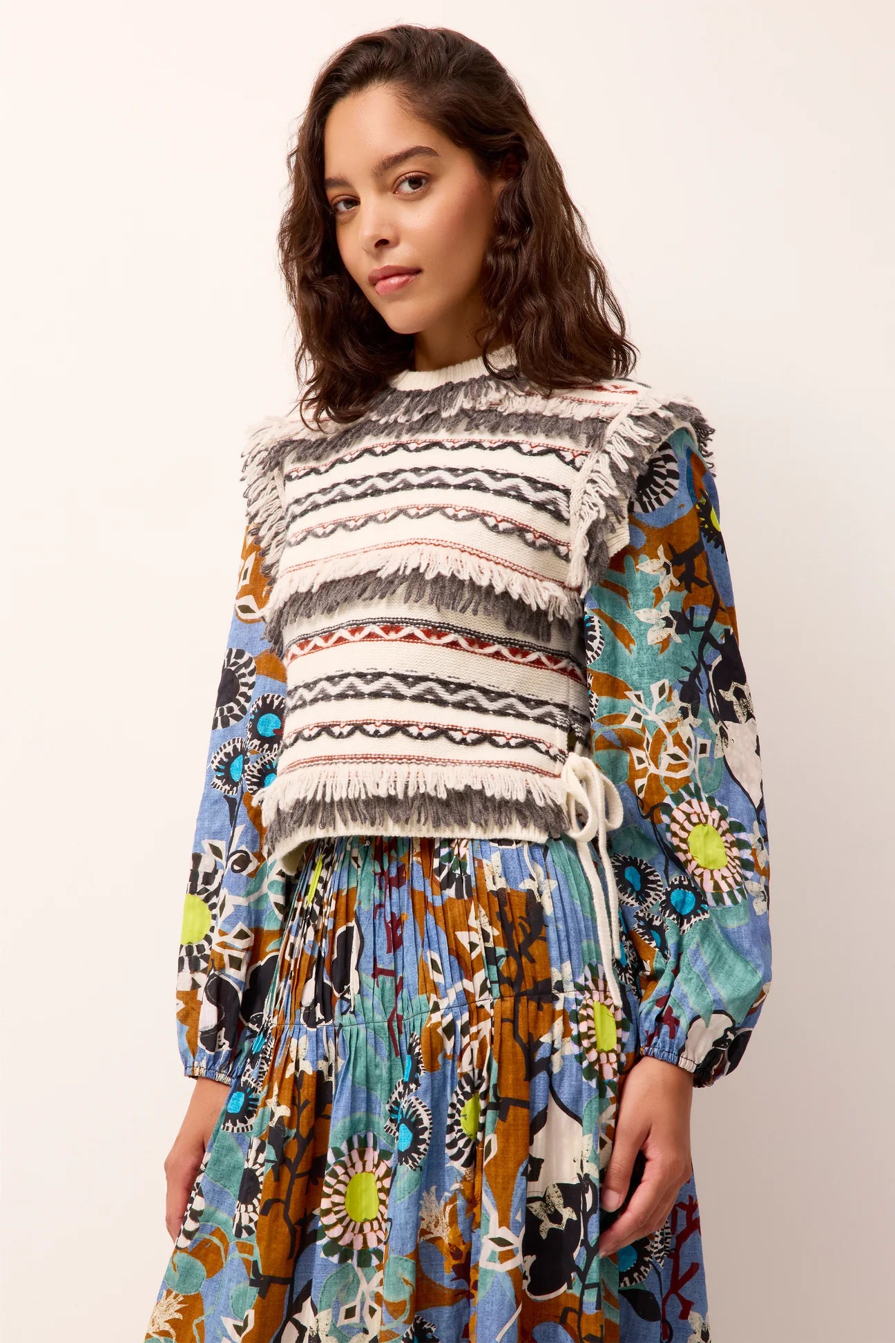 Calling all you maximalists: Desmond is for you. This novelty knit shell features striped fringe detailing, a boxy, cropped fit, and feminine side ties for added charm.