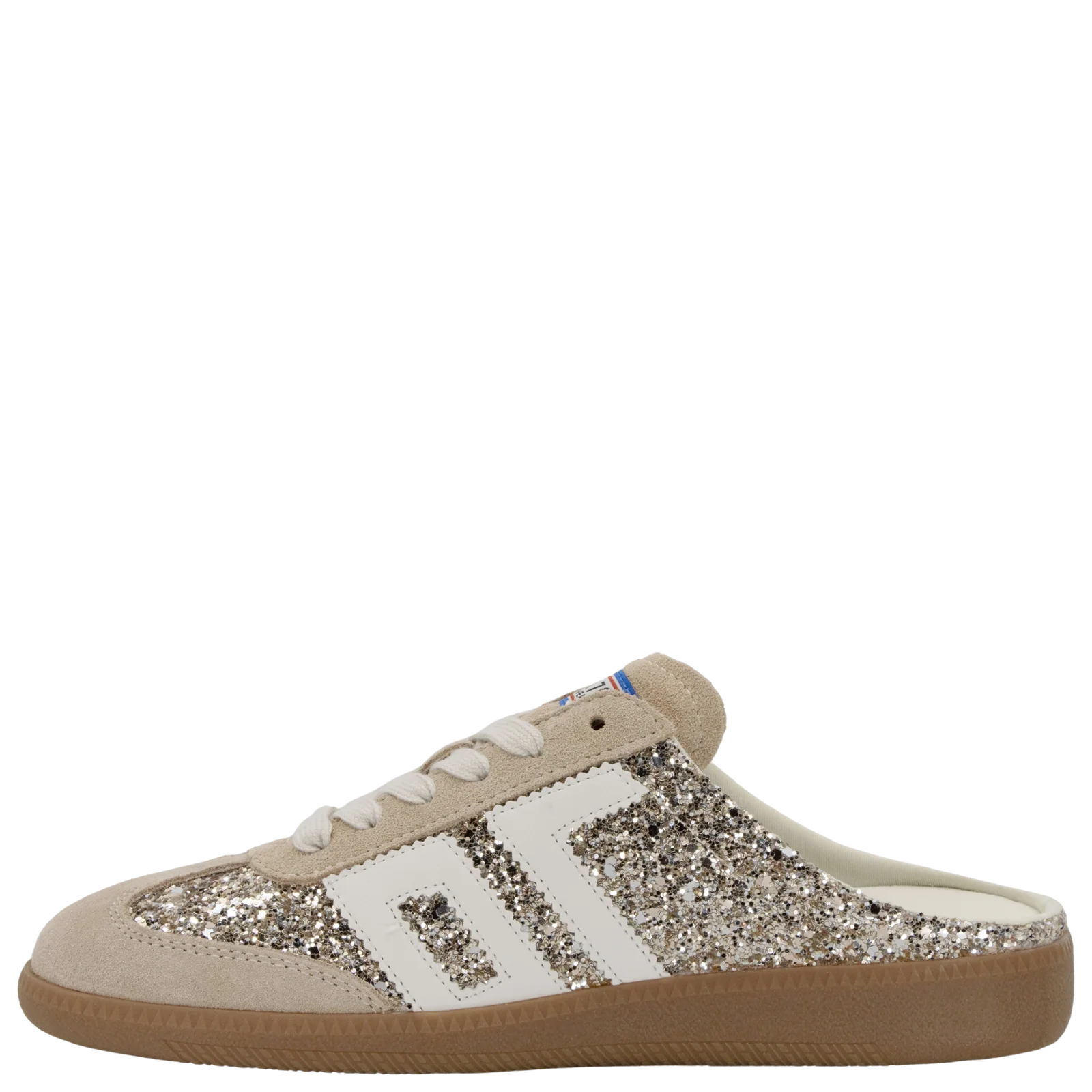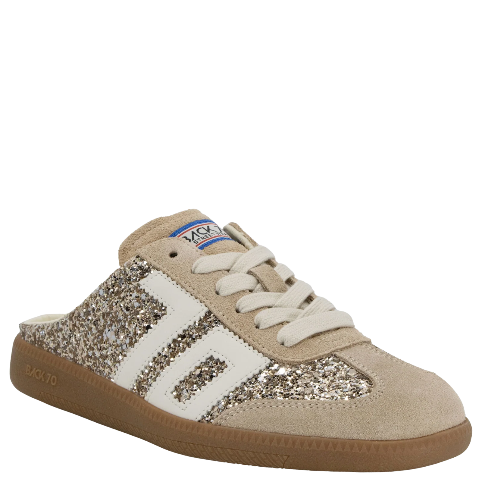 The Back 70 glitter mule brings sparkle to everyday style with a distinctly feminine, boho edge. Designed in shimmering gold glitter, this effortless sneaker mule blends laid-back charm with the brand’s signature vintage detailing. The open-back silhouette adds ease and personality, while subtle suede trims and retro accents keep it unmistakably Back 70. A perfect mix of glamour and casual cool, it’s made for the girlie girl who loves her sneakers with a little shine.