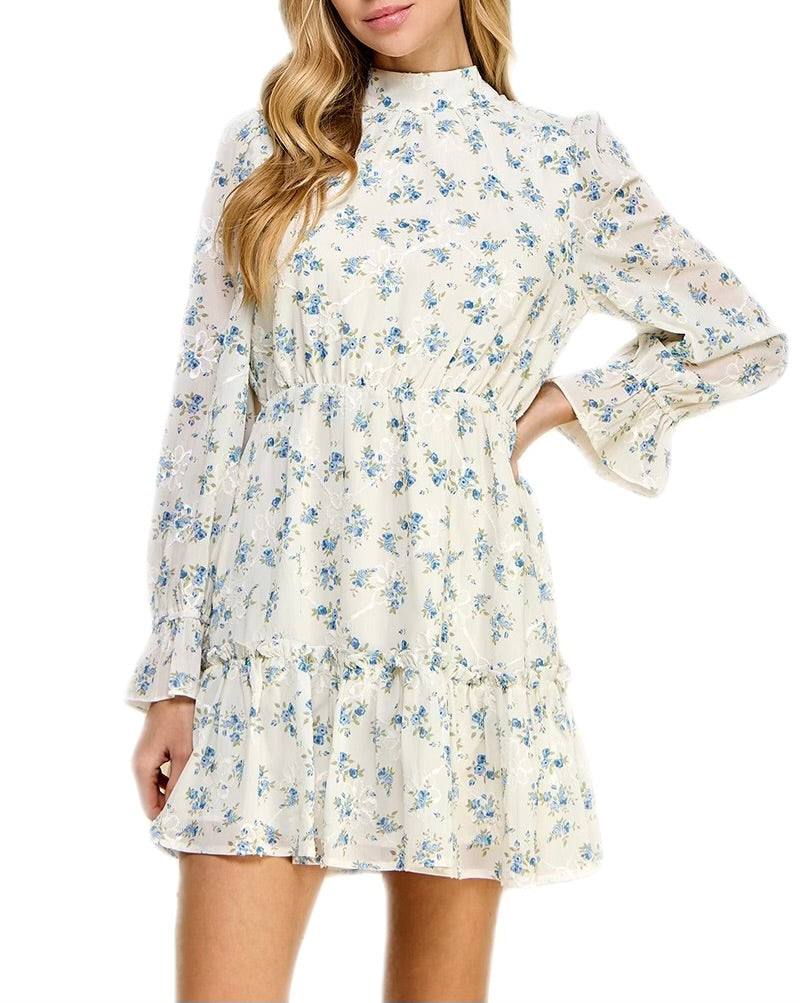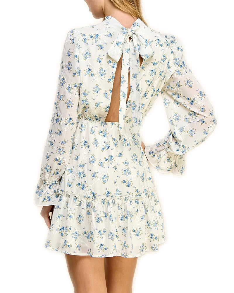 Textured, floral print long sleeve dress. With a mock neck, adjustable back tie, and an elastic waistband. Featuring a ruffle hem and a open back detail.