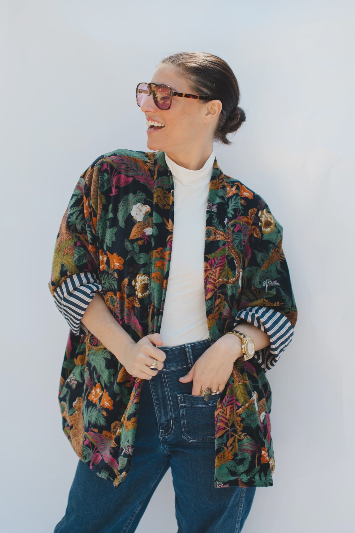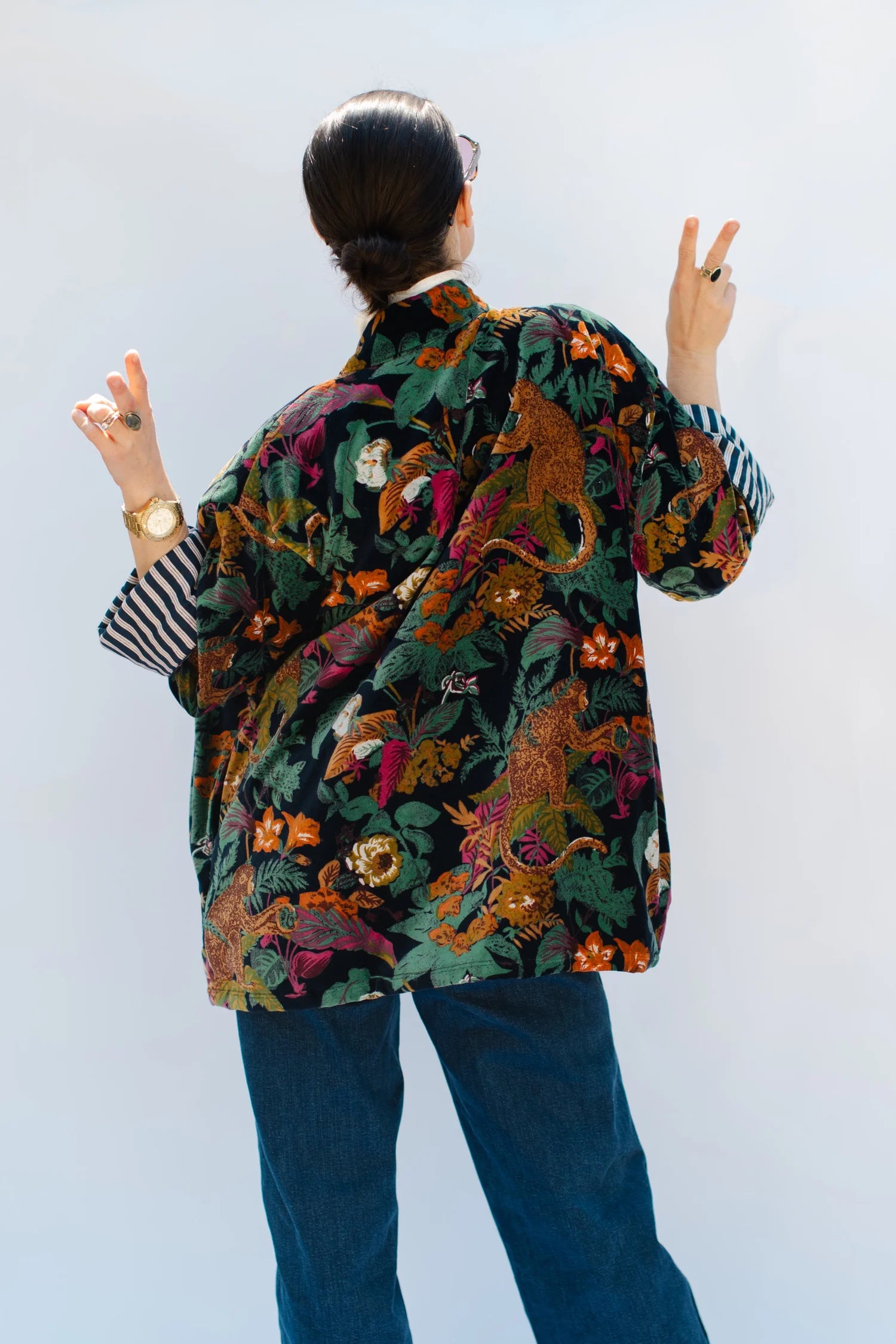 The Penny Velvet Lounge Jacket is your luxe layer with a laid-back edge. A hip-length swing coat drapes effortlessly while showcasing dramatic prints inspired by the White Lotus. Finished with roomy pockets and a soft striped cotton lining, it’s equal parts statement and everyday ease — the kind of jacket you’ll reach for on repeat.