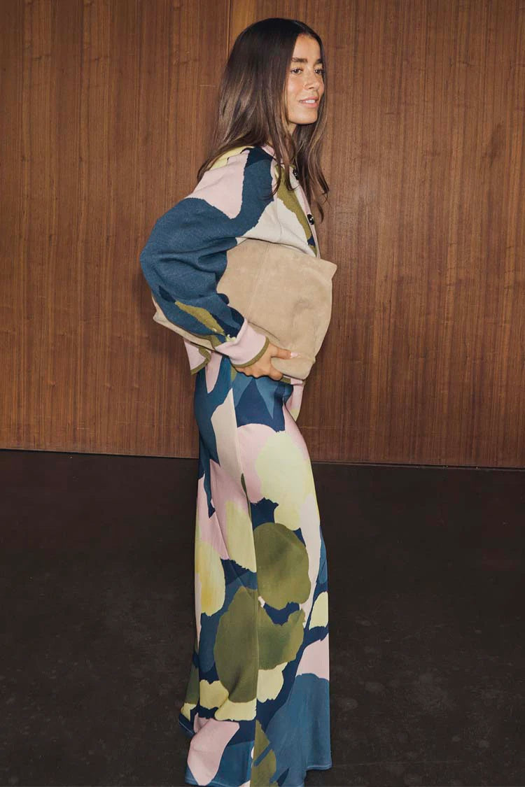 The Dorris silhouette in an abstract print, inspired by our iconic artist print, hand painted by our in-house design team and a definite trans-seasonal piece. Pair with the matching cardigan for an effortless co-ord or a jumper and heels for a day to night outfit. - Pull On - Elasticated Waist For a longer length look we suggest sizing up Composition: 100% Viscose Due to natural characteristics of viscose fibres, this style may shrink slightly when washed. Iron gently whilst damp to recover. Please remove jewellery when trying on this garment to avoid snagging. Length: 95cm centre back to hem Please Note - This length is based on our size 10 sample. Our products are graded, therefore smaller sizes will be shorter and larger sizes will be longer Base Colour: Multi Wash Care: 30 Degree Wash We’re more about the planet than we are perfection, so can’t guarantee the exact print placement shown here. This is down to how we cut the fabric to limit wastage.