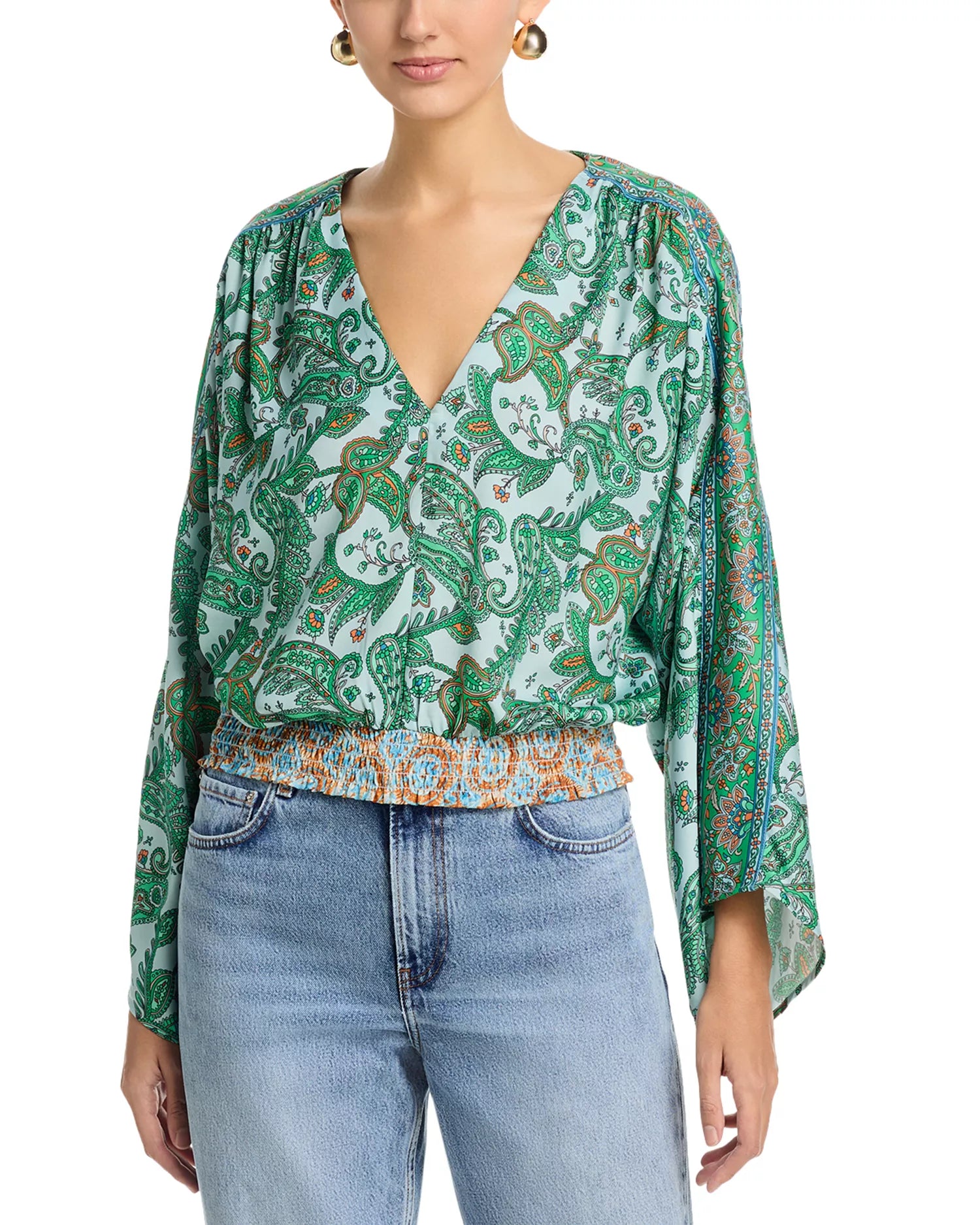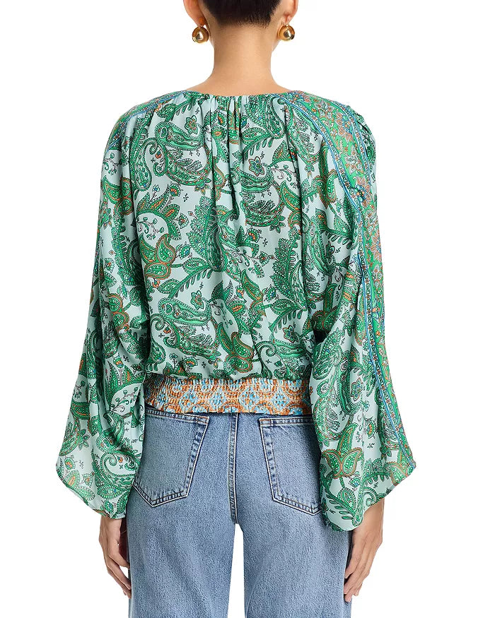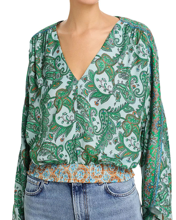 An updated '70s silhouette takes shape on this paisley-patterned top designed with an elasticized waist and flowy asymmetrically cuffed sleeves.